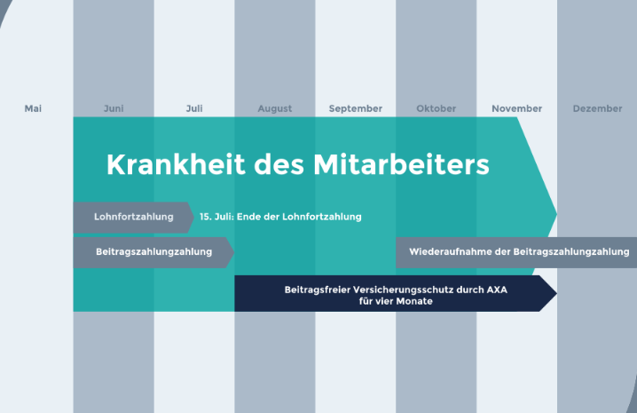 Fällt ein Arbeitnehmer aus der Lohnfortzahlung heraus, besteht bis zu 4 Monate beitragsfreier Versicherungsschutz. In dieser Zeit kann sich der Mitarbeiter ganz in Ruhe über die private Fortführung Gedanken machen.